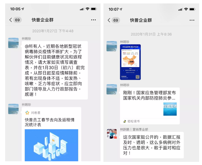 人力行政部快速啟動(dòng)“快普公司疫情防控工作”,通過(guò)問(wèn)卷登記、每日健康知識(shí)宣導(dǎo)、每日疫情發(fā)布,復(fù)工基本物資準(zhǔn)備等一系列措施,全面關(guān)注員工動(dòng)向及健康狀況,著力建設(shè)“平安快普”!