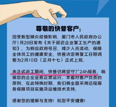 公司第一時(shí)間發(fā)布服務(wù)公告:未正式返工期間,快普將為客戶提供7*24h服務(wù),客戶可通過(guò)遠(yuǎn)程方式獲取運(yùn)維及項(xiàng)目實(shí)施等服務(wù)。