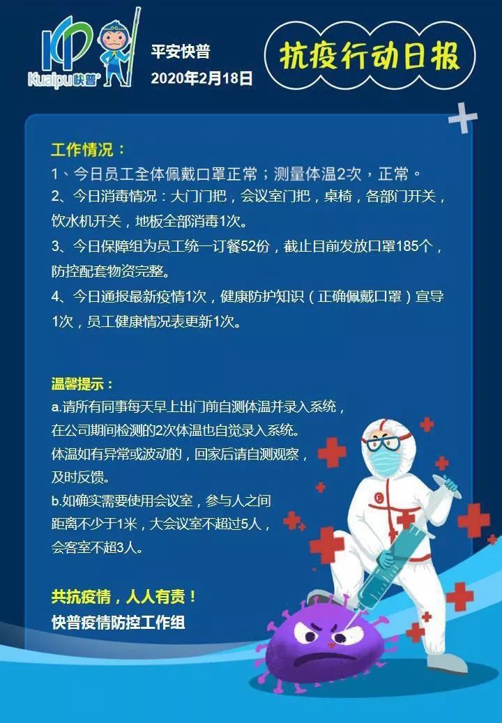 快普疫情防控工作組堅持“查、防、控”三大原則,嚴格遵循制度、規(guī)范開展工作,兢兢 業(yè)業(yè),全員上下一心,共同建設“平安快普”。