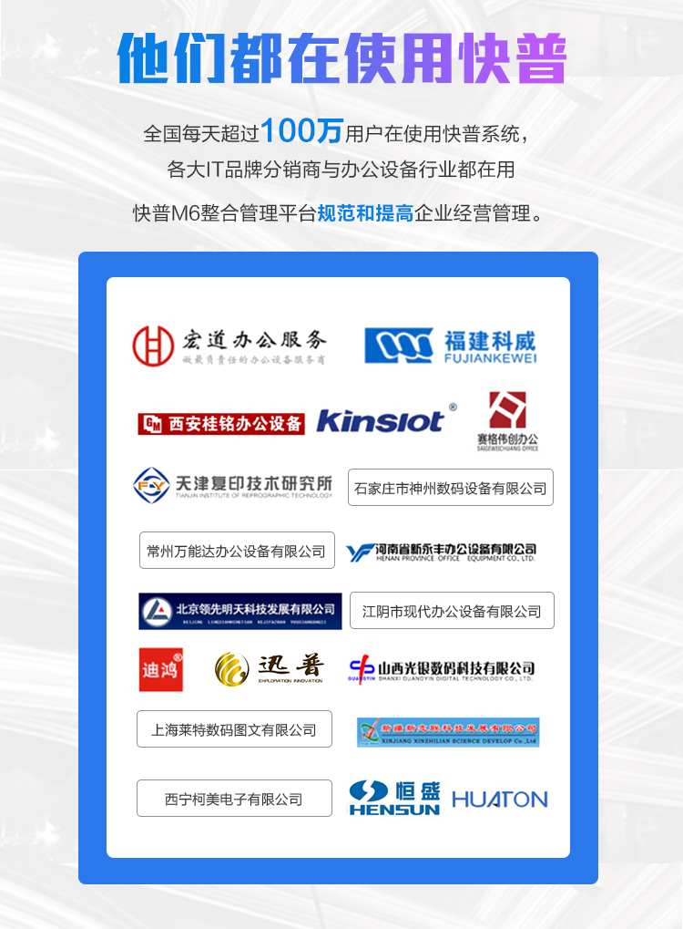 快普M6整合管理平臺(tái)整合了“協(xié)同辦公、客戶關(guān)系管理、供應(yīng)鏈管理、財(cái)務(wù)管理、運(yùn)維服務(wù)管理、租賃抄表管理、生產(chǎn)管理、研發(fā)管理、人力資源管理、電子商務(wù)管理”等業(yè)務(wù)系統(tǒng),同時(shí)實(shí)現(xiàn)與移動(dòng)互聯(lián)應(yīng)用、電話呼叫中心、郵件系統(tǒng)、手機(jī)短信、考勤機(jī)、手持終端等各種硬件設(shè)備無(wú)縫銜接。