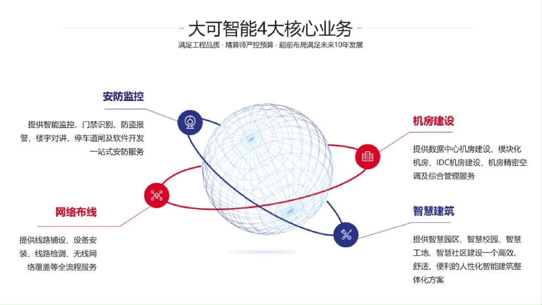 大可智能在行業(yè)內(nèi)率先提出“零分包”管理模式,并且自主要求每一個(gè)實(shí)施員工執(zhí)行公司制定的標(biāo)準(zhǔn)化施工規(guī)范,有效降低工程的成本,提高運(yùn)轉(zhuǎn)效率,為客戶提供更高效的咨詢(xún)、規(guī)劃、設(shè)計(jì)、施工、運(yùn)維一站式的解決方案。