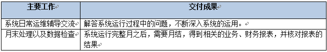 該階段主要是做系統(tǒng)開賬運作之后,持續(xù)支持運用中出現的所有問題,系統(tǒng)運行完整月之后,指導月結,得到相關的報表數據。該階段結束以《持續(xù)支持里程碑確認單》作為交付。
