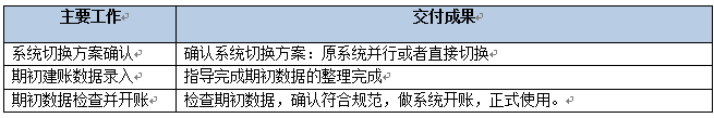 該階段主要是確認系統(tǒng)的切換方案,檢查系統(tǒng)啟賬之前的所有準備的數據的情況,確認開賬。該階段結束以《上線切換階段里程碑確認單》作為交付。