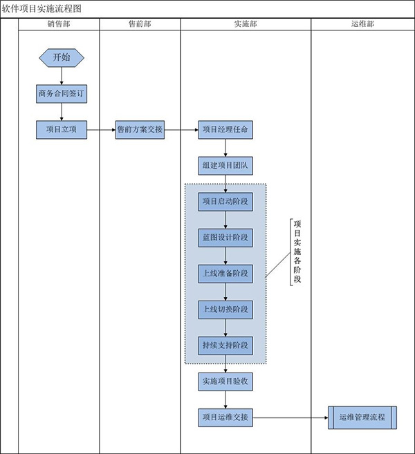 快普軟件項目實施分為五個階段:項目啟動階段、藍圖設計階段、上線準備階段、上線切換階段、持續(xù)支持階段。每個階段都有對應的階段交付成果。完成這五個階段的任務之后,進入實施項目驗收階段。實施驗收完成之后,轉入運維部門,實施過程結束。