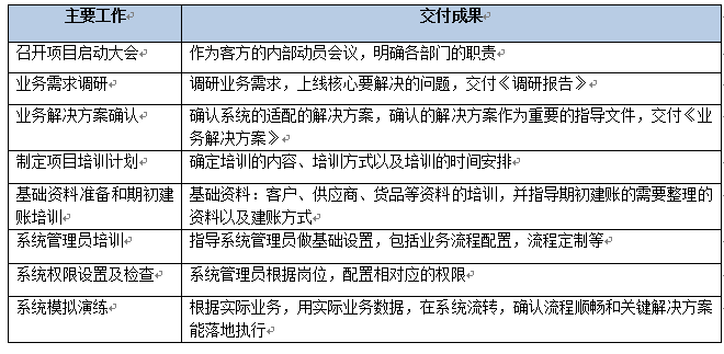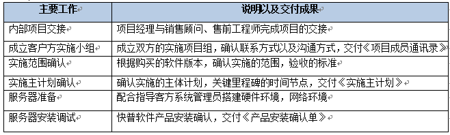 該階段主要是做實施基礎的搭建,包括完成內部交接、確認雙方的項目組成員名單、確認實施范圍、確認實施計劃、服務器準備以及軟件部署。該階段結束以《項目啟動階段里程碑確認單》作為交付。